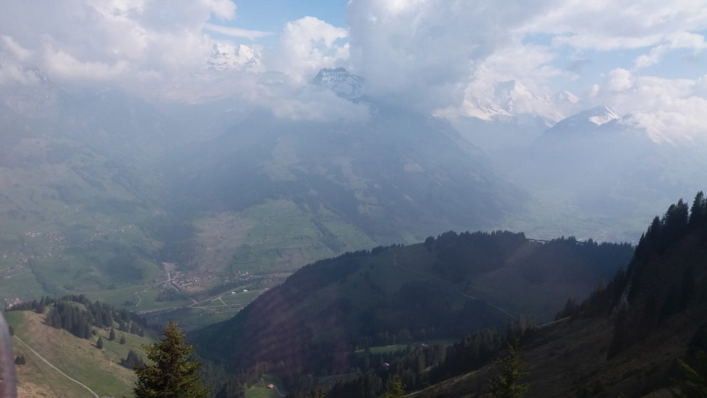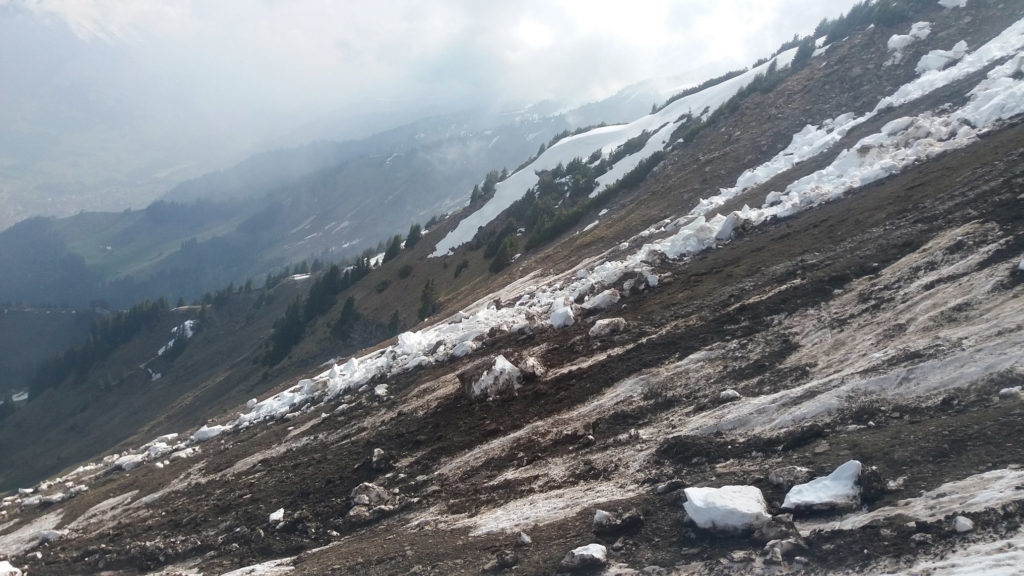 Der Niesen hat den Hut tief ins Gesicht gezogen. Die Aussicht war kurzsichtig. Kürzlich stob eine Lawine der Bahn entlang. Die Schneeblöcke werden noch etwas liegen bleiben. Sehr eindrücklich, was alles mitgerissen wurde.